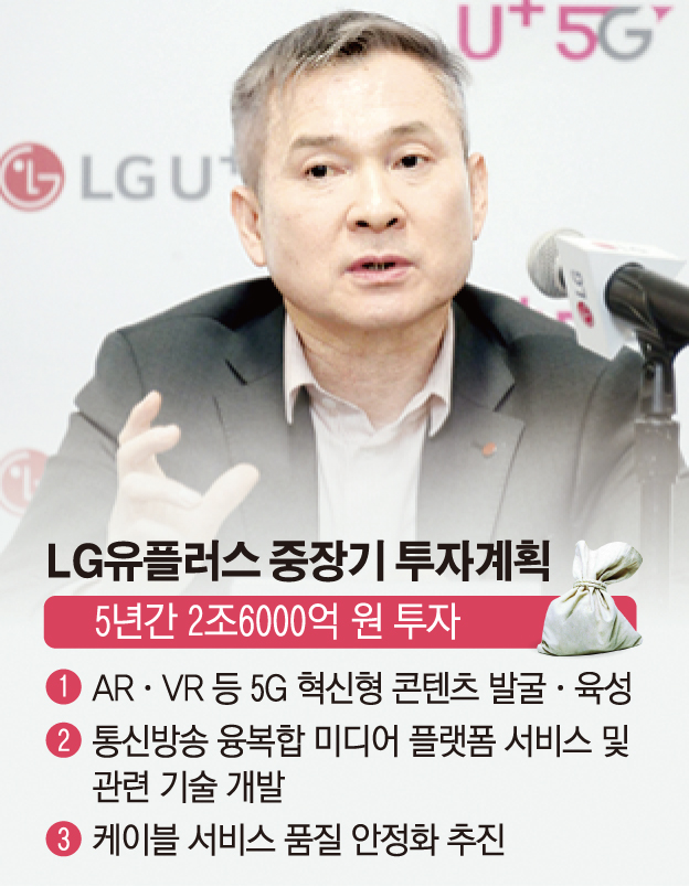 LG유플러스는 5년간 2조6000억 원 규모를 △ARㆍVR 등 5G 혁신형 콘텐츠 발굴ㆍ육성 △통신방송 융복합 미디어 플랫폼 서비스 및 관련 기술 개발 △케이블 서비스 품질 안정화 등에 초점을 맞춰 투자할 계획이다.