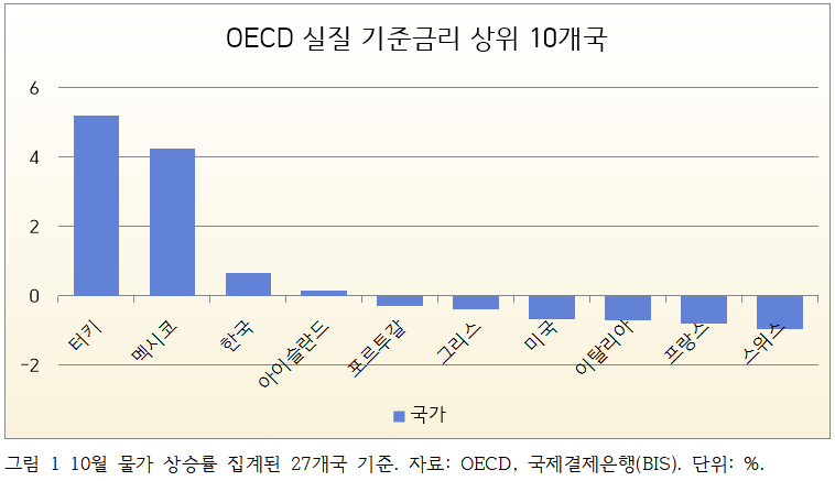 18일 OECD와 국제결제은행(BIS) 등에 따르면 10월 한국의 실질 기준금리는 연 0.65%였다. 실질 기준금리는 명목 기준금리에서 근원물가(농산물·석유류 제외지수) 상승률을 뺀 값이다. 한국의 실질 기준금리는 10월 물가 상승률이 집계된 OECD 27개 회원국 가운데 터키(5.20%), 멕시코(4.25%)에 이어 세 번째로 높았다.