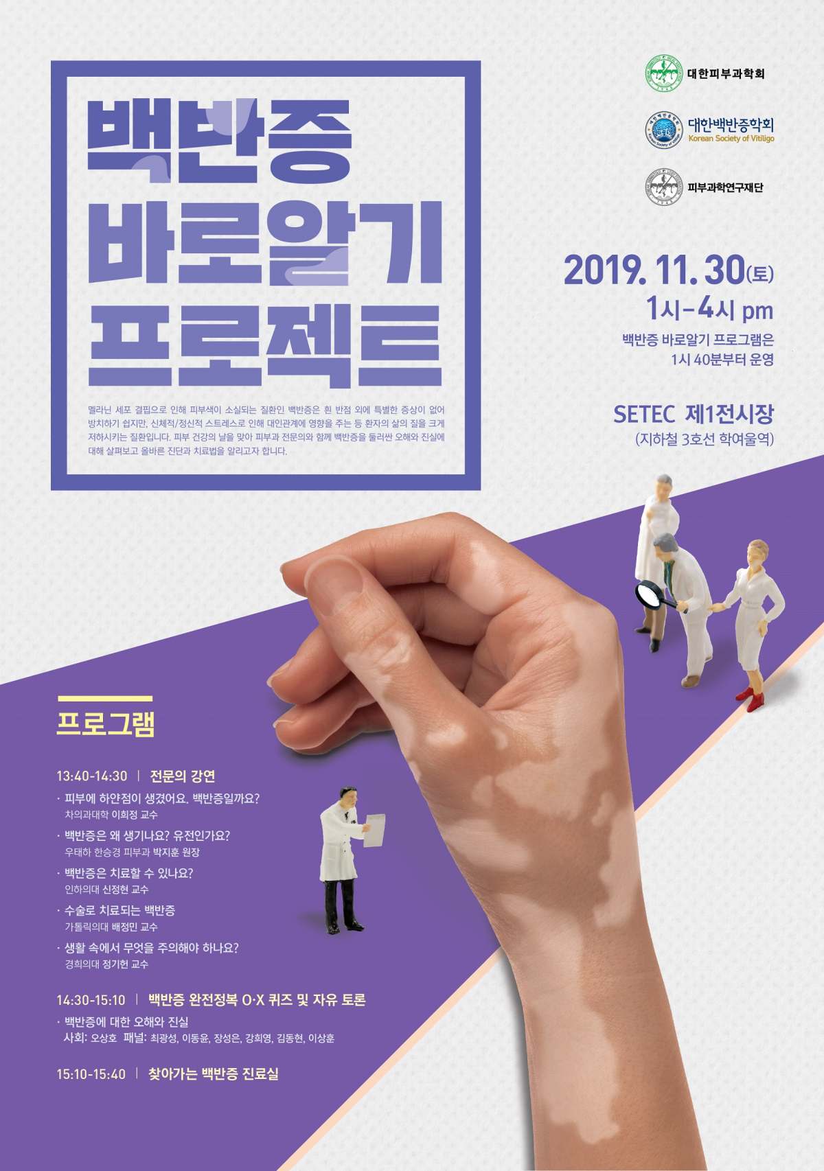대한피부과학회가 제 17회 피부건강의 날을 맞아 ‘백반증 바로알기 프로젝트’를 진행한다고 19일 밝혔다. 올해로 17회차를 맞이한 피부건강의 날에는 피부에 하얀 반점이 생기는 질환인 ‘백반증’이 주제로 선정됐다.