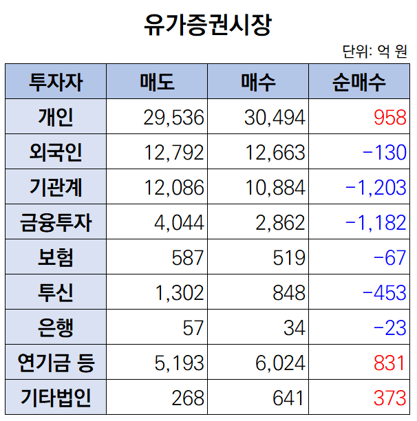이날 기관과 외국인은 각각 1203억 원, 130억 원어치를 순매도했다. 개인은 홀로 958억 원 규모 매물을 소화했다.