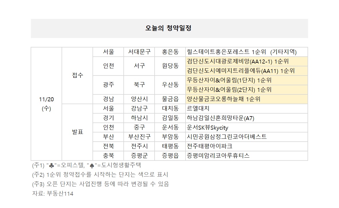 부동산114에 따르면 이날 1순위 청약이 예정된 곳은 인천 서구 '검단신도시 대광로제비앙(AA12-1)', 광주 북구 '무등산 자이&어울림(1단지)' '무등산 자이&어울림(2단지)', 경남 양산시 '양산 물금 코오롱하늘채' 등이다.