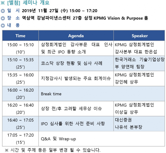 삼정KPMG가 27일 역삼동 강남파이낸스센터 본사에서 기업공개(IPO) 예비 기업들을 대상으로 ‘4회 IPO 성공전략 세미나’를 개최한다고 20일 밝혔다.