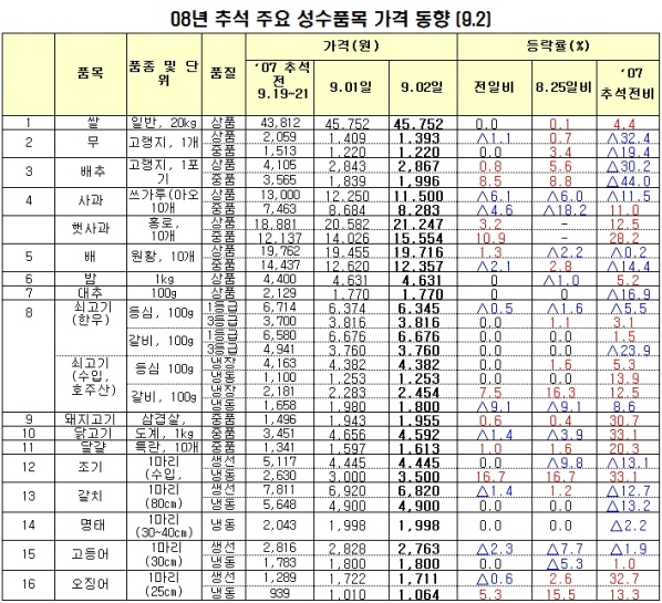 [표] 2일 현재 추석 주요 성수품 가격 동향