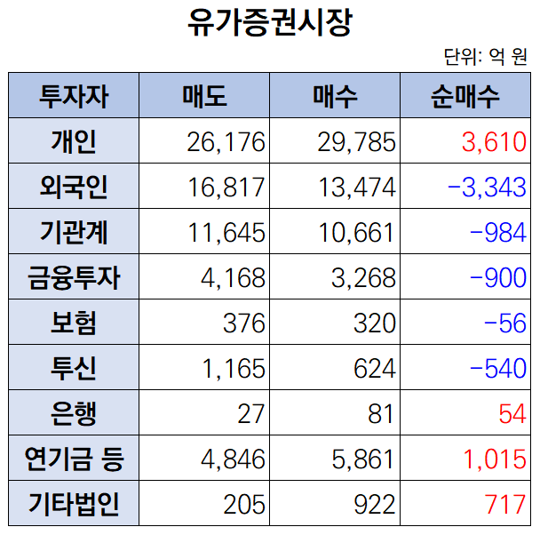 이날 외국인과 기관은 각각 3343억 원, 984억 원어치를 순매도했다. 개인은 홀로 3610억 원을 순매수했다.