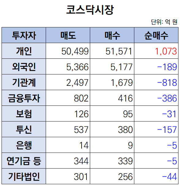 이날 기관과 외국인은 각각 818억 원, 189억 원어치를 순매도하며 2거래일 연속 매도 공세에 나섰다. 반면 개인은 홀로 1073억 원어치를 사들였다.