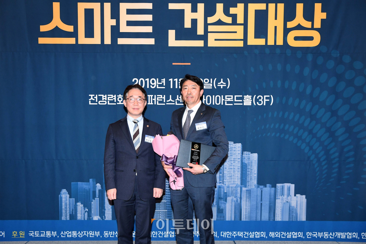 20일 서울 여의도 전경련회관 컨퍼런스센터에서 열린 ‘2019 이투데이 스마트 건설대상’에서 시상자인 박선호(왼쪽) 국토교통부 차관과 종합대상인 국토교통부장관상을 수상한 대우건설의 배태선 부장이 기념촬영을 하고 있다. 이투데이 스마트 건설대상은 대한민국 건설사들의 주택사업·친환경·동반성장 등의 성과를 나누고 우수기업에 대한 시상을 하는 자리다.