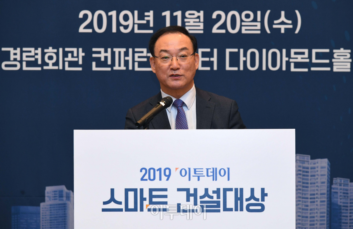 20일 서울 여의도 전경련회관 컨퍼런스센터에서 열린 ‘2019 이투데이 스마트 건설대상’에서 심사위원장인 권대중 명지대 부동산대학원 교수가 심사평을 하고 있다. 이투데이 스마트 건설대상은 대한민국 건설사들의 주택사업·친환경·동반성장 등의 성과를 나누고 우수기업에 대한 시상을 하는 자리다.