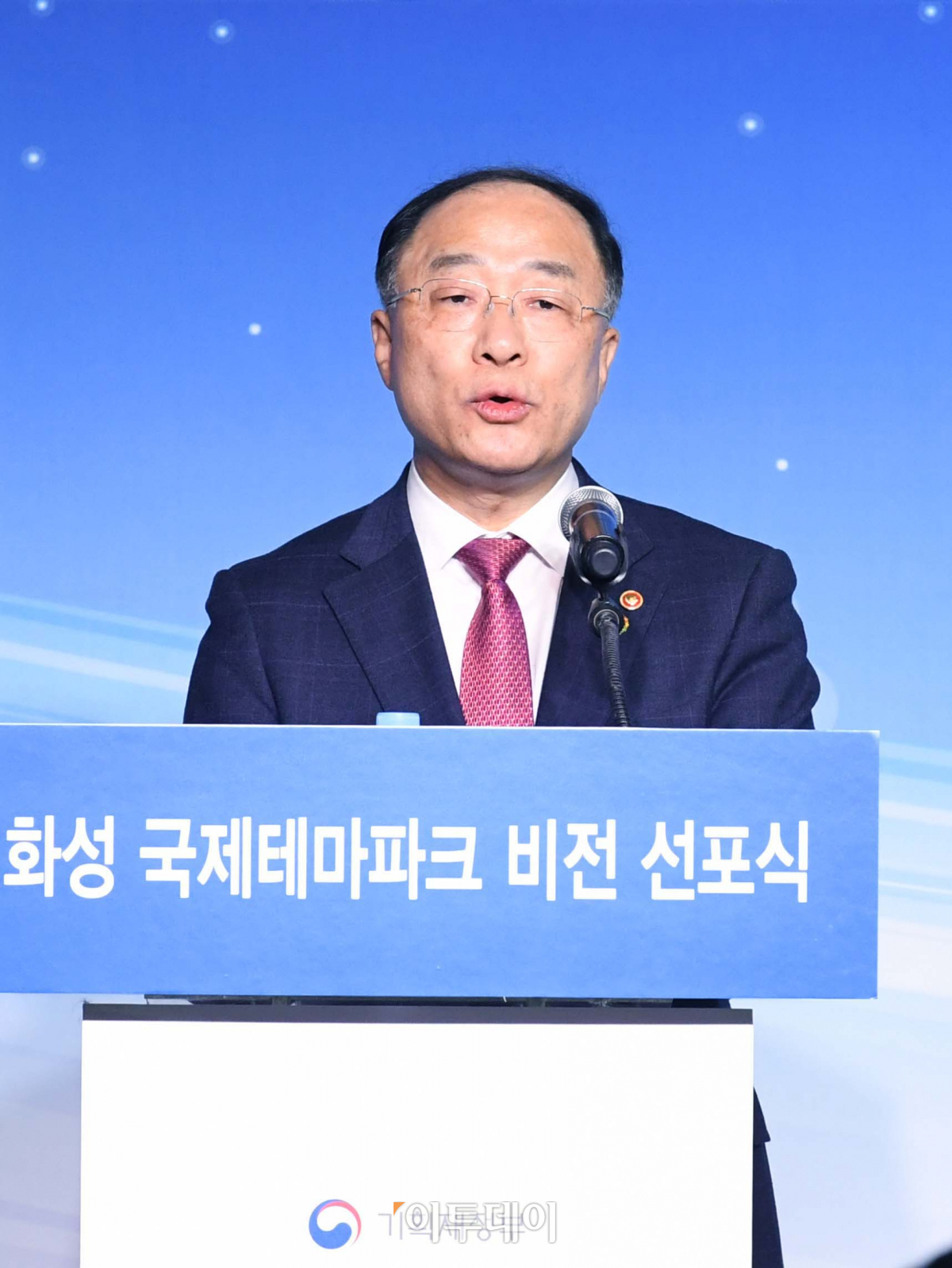 홍남기 부총리 겸 기획재정부 장관이 21일 경기 화성시 국제테마파크 부지에서 열린 ‘화성테마파크 비전 선포식’에서 축사를 하고 있다. 2026년 1단계 오픈과 2031년 그랜드 오픈을 목표로 화성국제테마파크엔 놀이기구 중심의 ‘어드벤처월드’, 휴양워터파크 ‘퍼시픽오딧세이’, 공룡테마 ‘쥬라지월드’, 키즈파크 ‘브릭&토이 킹덤’ 등 총 4가지 콘셉트로 구성된 테마파크와 호텔, 전문쇼핑몰, 골프장 등 세계적 수준의 복합 리조트형 테마파크가 조성된다.