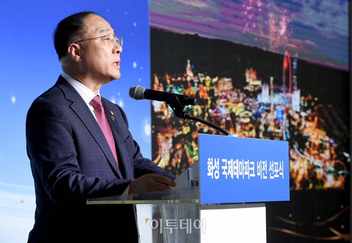 홍남기 부총리 겸 기획재정부 장관이 21일 경기 화성시 국제테마파크 부지에서 열린 ‘화성테마파크 비전 선포식’에서 축사를 하고 있다. 2026년 1단계 오픈과 2031년 그랜드 오픈을 목표로 화성국제테마파크엔 놀이기구 중심의 ‘어드벤처월드’, 휴양워터파크 ‘퍼시픽오딧세이’, 공룡테마 ‘쥬라지월드’, 키즈파크 ‘브릭&토이 킹덤’ 등 총 4가지 콘셉트로 구성된 테마파크와 호텔, 전문쇼핑몰, 골프장 등 세계적 수준의 복합 리조트형 테마파크가 조성된다.
