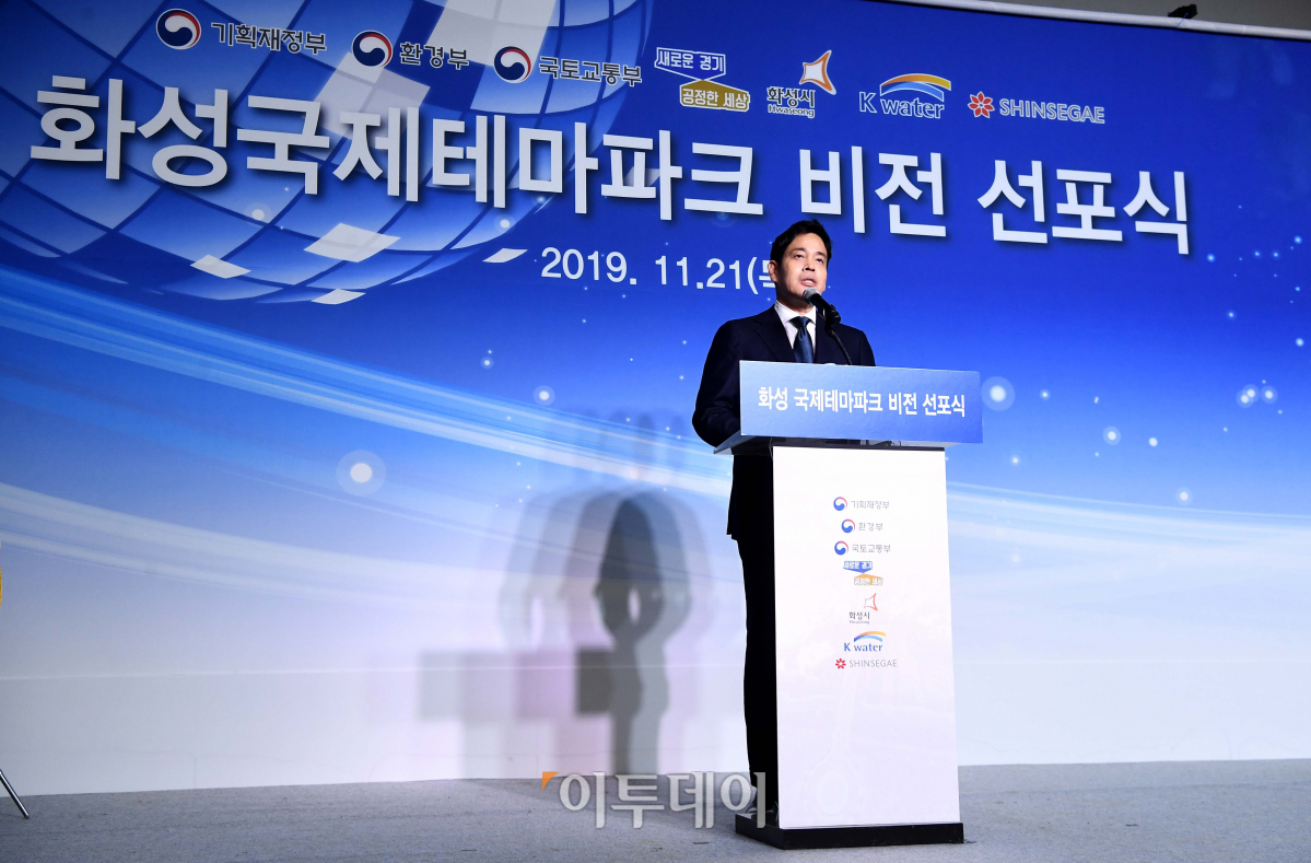 정용진 신세계그룹 부회장이 21일 경기 화성시 국제테마파크 부지에서 열린 ‘화성테마파크 비전 선포식’에서 비전을 선포하고 있다. 2026년 1단계 오픈과 2031년 그랜드 오픈을 목표로 화성국제테마파크엔 놀이기구 중심의 ‘어드벤처월드’, 휴양워터파크 ‘퍼시픽오딧세이’, 공룡테마 ‘쥬라지월드’, 키즈파크 ‘브릭&토이 킹덤’ 등 총 4가지 콘셉트로 구성된 테마파크와 호텔, 전문쇼핑몰, 골프장 등 세계적 수준의 복합 리조트형 테마파크가 조성된다.