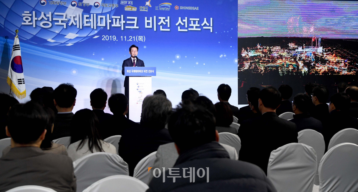 이재명 경기도지사가 21일 경기 화성시 국제테마파크 부지에서 열린 ‘화성테마파크 비전 선포식’에서 축사를 하고 있다. 2026년 1단계 오픈과 2031년 그랜드 오픈을 목표로 화성국제테마파크엔 놀이기구 중심의 ‘어드벤처월드’, 휴양워터파크 ‘퍼시픽오딧세이’, 공룡테마 ‘쥬라지월드’, 키즈파크 ‘브릭&토이 킹덤’ 등 총 4가지 콘셉트로 구성된 테마파크와 호텔, 전문쇼핑몰, 골프장 등 세계적 수준의 복합 리조트형 테마파크가 조성된다.