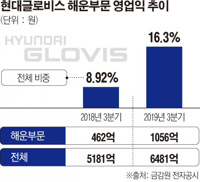 22일 금융감독원 전자공시에 따르면 현대글로비스의 3분기 누적 해운 부문 영업이익은 1056억 원으로, 전체 영업이익의 16.30%를 차지했다. 지난해 같은 기간 462억 원의 이익을 올려 8.92%의 비중에 머물렀던 것과 비교하면 1년 새 비중이 두 배 가까이 늘어난 셈이다.