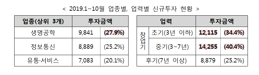 업종별로는 최근 벤처캐피탈의 많은 관심을 받고 있는 생명공학 업종이 27.9%로 가장 큰 비중을 차지했고 정보통신 업종이 25.2%로 그 뒤를 이었다. 업력별로는 창업한 지 3~7년 사이 스케일업 단계(Scale-up) 투자가 40.4%로 가장 많고, 다음으로 3년 이내 초기단계 투자가 34.4%를 차지했다.