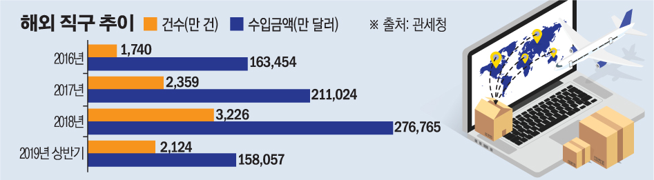 가격 경쟁력을 무기로 한 해외 직구 시장은 매년 30~40%씩 급성장하고 있다. 24일 관세청에 따르면 해외 직구 규모는 2016년 1740만 건, 16억3454만 달러(약 1조9300억 원)에서 이듬해 2359만 건, 21억1024억 달러(약 2조4900억 원)로 건수는 35.6%, 금액으로는 29.1% 증가했다. 지난해에는 3226만 건, 27억6765만 달러(약 3조2600억 원)를 기록해 전년 대비 각각 36.7%, 31.1%로 증가폭을 확대했다. 올해는 상반기에만 이미 2124만 건, 15억8057만 달러로 집계돼 중국 광군제와 미국 블랙프라이데이 등 연말 할인행사가 집중된 하반기를 합치면 올해 해외 직구는 30억 달러를 무난히 돌파할 것으로 전망된다.