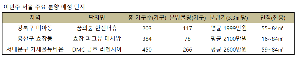 25일 업계에 따르면 오는 27일 강북구 미아동 '꿈의숲 한신더휴'의 1순위 청약을 시작으로 서대문구 가재울뉴타운'DMC 금호 리첸시아', 용산구 효창동 '효창 파크뷰 데시앙'가 줄줄이 청약자 모집에 나선다.