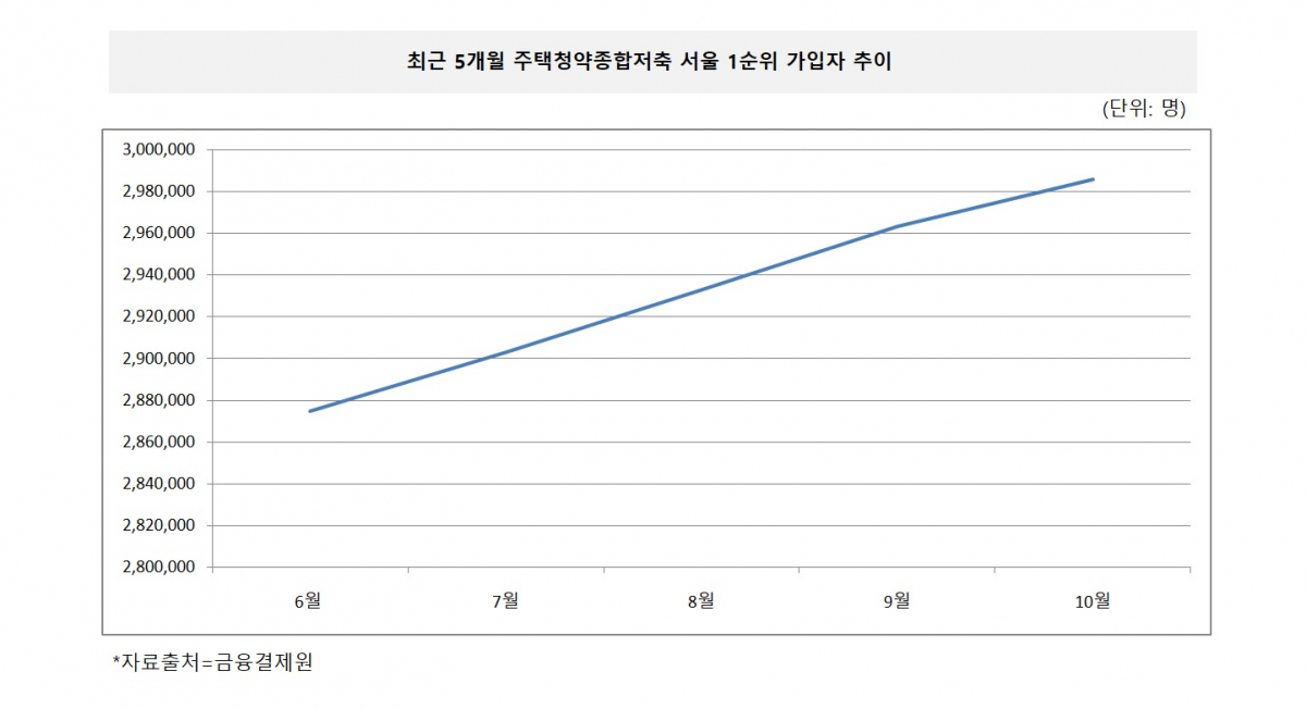 이 가운데 서울의 1순위 자격을 갖춘 청약통장 가입자는 298만6041명으로 전월(296만3599명)보다 2만2442명(0.76%) 늘었다. 300만 명에 육박한 수치다. 같은 기간 2순위 가입자는 290만3641명에서 289만9210명으로 4431명(0.15%) 줄었다.