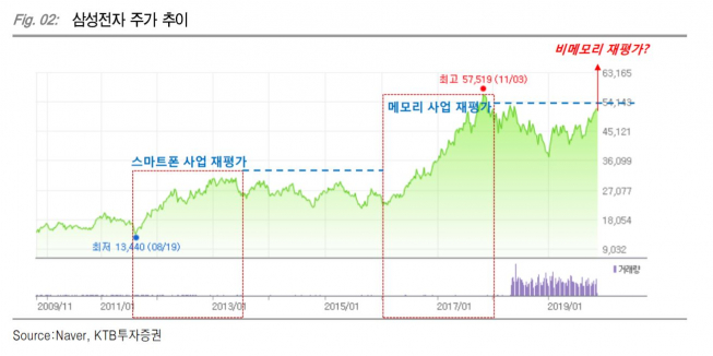 KTB투자증권은 26일 삼성전자에 대해 비메모리 반도체 사업 재평가에 따라 주가 상승을 기대한다며 목표주가 5만8000원, 투자의견 매수를 유지했다.