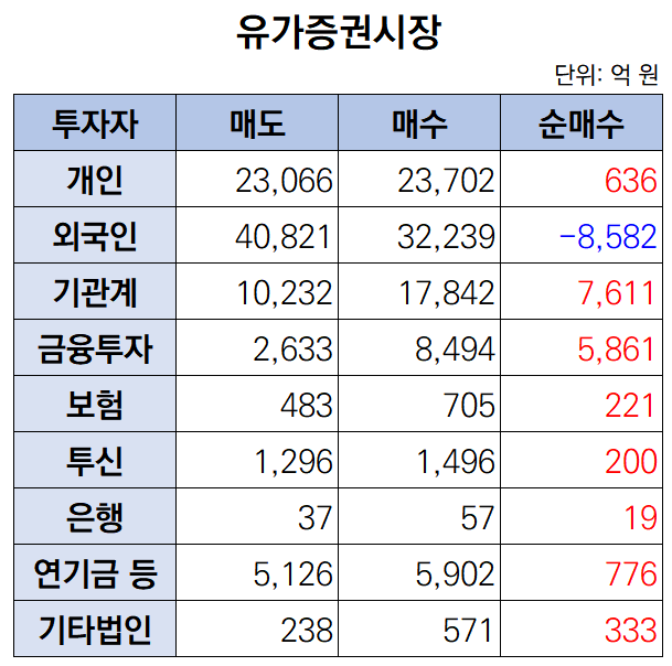 기관 중에서는 금융투자가 5861억 원, 연기금 등이 776억 원어치를 사들였다. 외에도 보험 221억 원, 투신 200억 원, 은행 19억 원 등 순매수 행렬이 이어졌다.