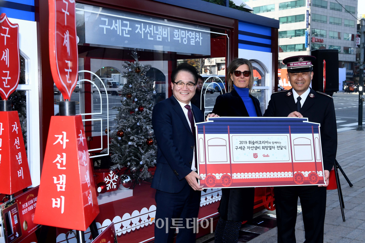 루시아(뒷줄 오른쪽부터) 휘슬러 글로벌 세일즈 총괄이사, 김필수 한국 구세군 사령관 등이 27일 서울 중구 서울광장에서 열린 한국 구세군·휘슬러코리아가 함께하는 ‘구세군 자선냄비 희망열차’ 전달식에서 기념촬영을 하고 있다. ‘희망열차’는 따뜻한 나눔의 손길은 절망도 희망으로 바꿀 값진 위로임을 알리고, 열차와 같이 희망찬 나눔의 길을 꾸준히 달려나가겠다는 의미로 기획됐다.