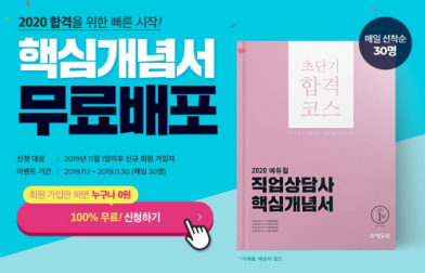 에듀윌의 직업상담사 핵심개념서는 11월 1일 이후 신규 가입한 회원이라면 누구나 신청할 수 있으며, 오는 30일까지 매일 30명에게 무료로 제공한다