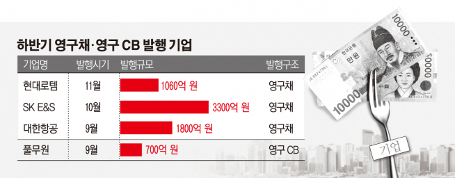 이 밖에도 지난달 SK의 자회사 SK E&S가 3300억 원, 대한항공이 9월 1800억 원가량의 영구채를 발행했다. 특히 대한항공의 경우 5월 영구채를 통해 2000억 원 규모의 자금을 조달한 데 이어 올해만 두 번째 발행 결정이다. 풀무원도 9월 700억 원 규모 30년 만기 영구 CB를 발행했다.