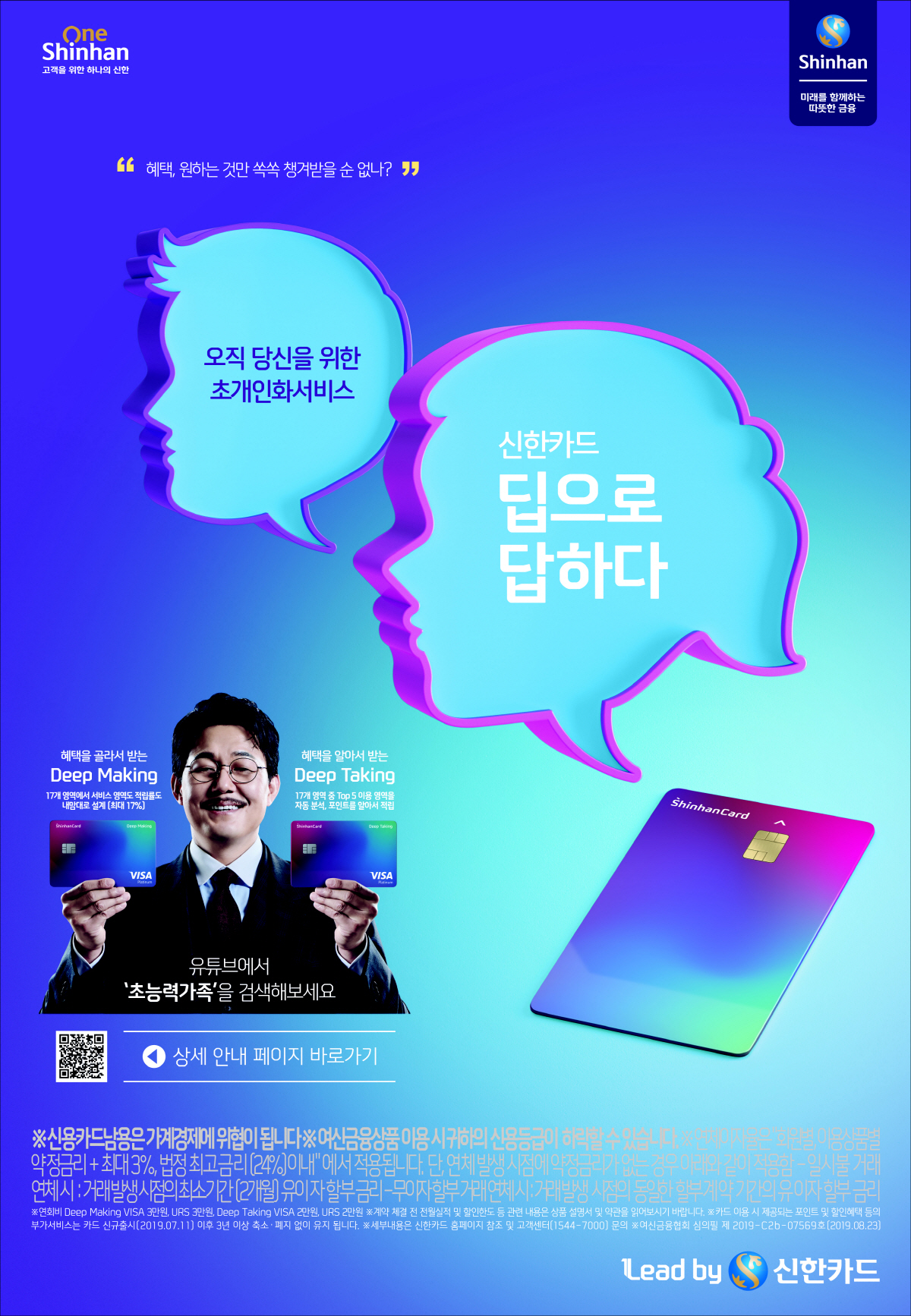 신한카드는 디지털 시대를 맞아 ‘빅데이터’와 ‘인공지능’을 통해 어떻게 하면 2200만 고객 개인에게 맞춤형 서비스를 제공할 수 있을지 깊게 고민해왔습니다. 2019년 하반기 새롭게 출시한 ‘Deep Making, Deep Taking 카드’는 이러한 고객의 요구를 반영해 카드 혜택과 서비스가 일률적으로 제공되는 것이 아니라 고객별로 달리 제공되는 ‘초개인화’ 상품입니다.