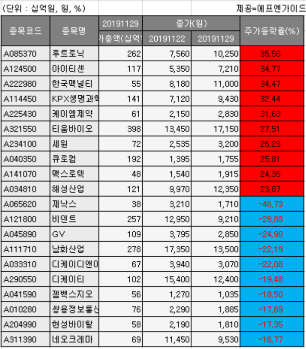 한 주간 빗썸홀딩스 인수를 결정한 비덴트(-28.88%), 하동 화공화학 보세공업단지 프로젝트에 참여한다고 밝힌 GV(-24.90%) 등은 호재 발표에도 낙폭을 키웠다. 디케이디앤아이(-22.08%)도 하락 상위권을 기록했다.