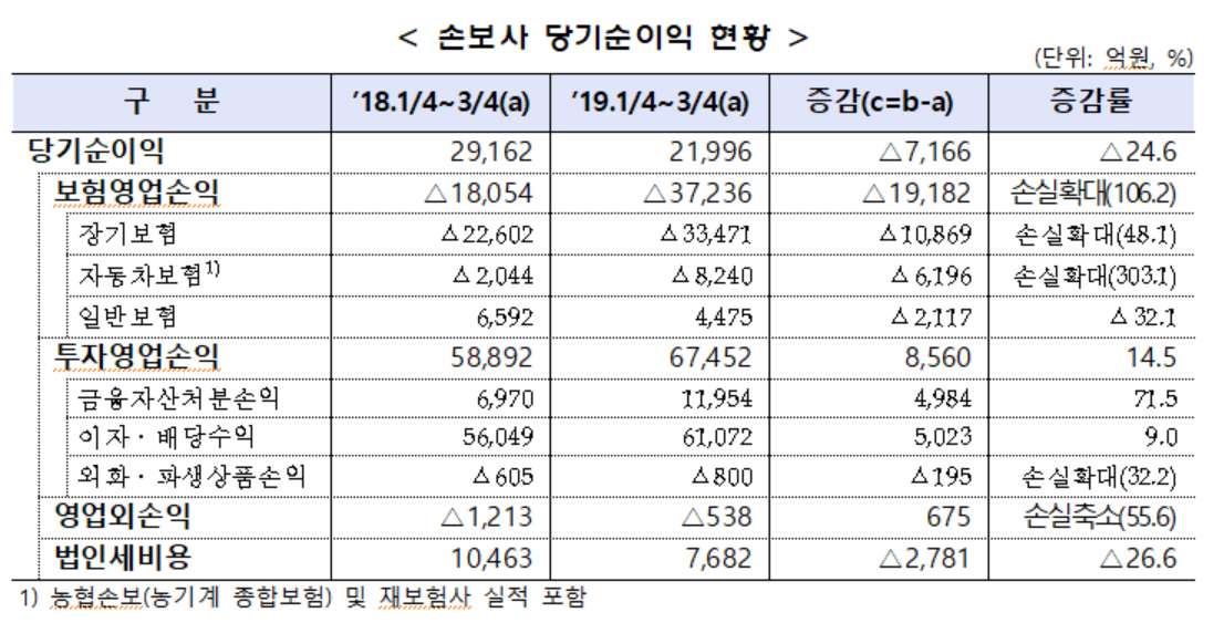 보험영업손실은 3조7000억 원으로 장기보험과 자동차보험의 손실확대로 손실규모가 전년 동기(1조8000억 원) 대비 1조9000억 원(106.2%) 증가 했다.