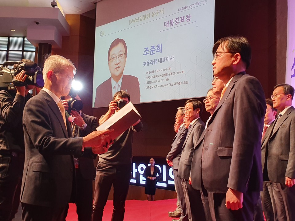 모바일 소프트웨어 전문 기업 유라클의 조준희 대표가 지난 2일 열린 ‘2019년 소프트웨어 산업인의 날 기념식’에서 소프트웨어산업발전 유공자로 선정되어 대통령 표창을 받았다.