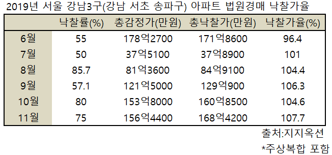 3일 법원경매 전문업체 지지옥션에 따르면 11월 서울 강남3구(강남ㆍ서초ㆍ송파구) 아파트 법원경매 낙찰가율(감정가 대비 낙찰가 비율)은 107.7%를 기록했다. 올 들어 가장 높은 수치다.