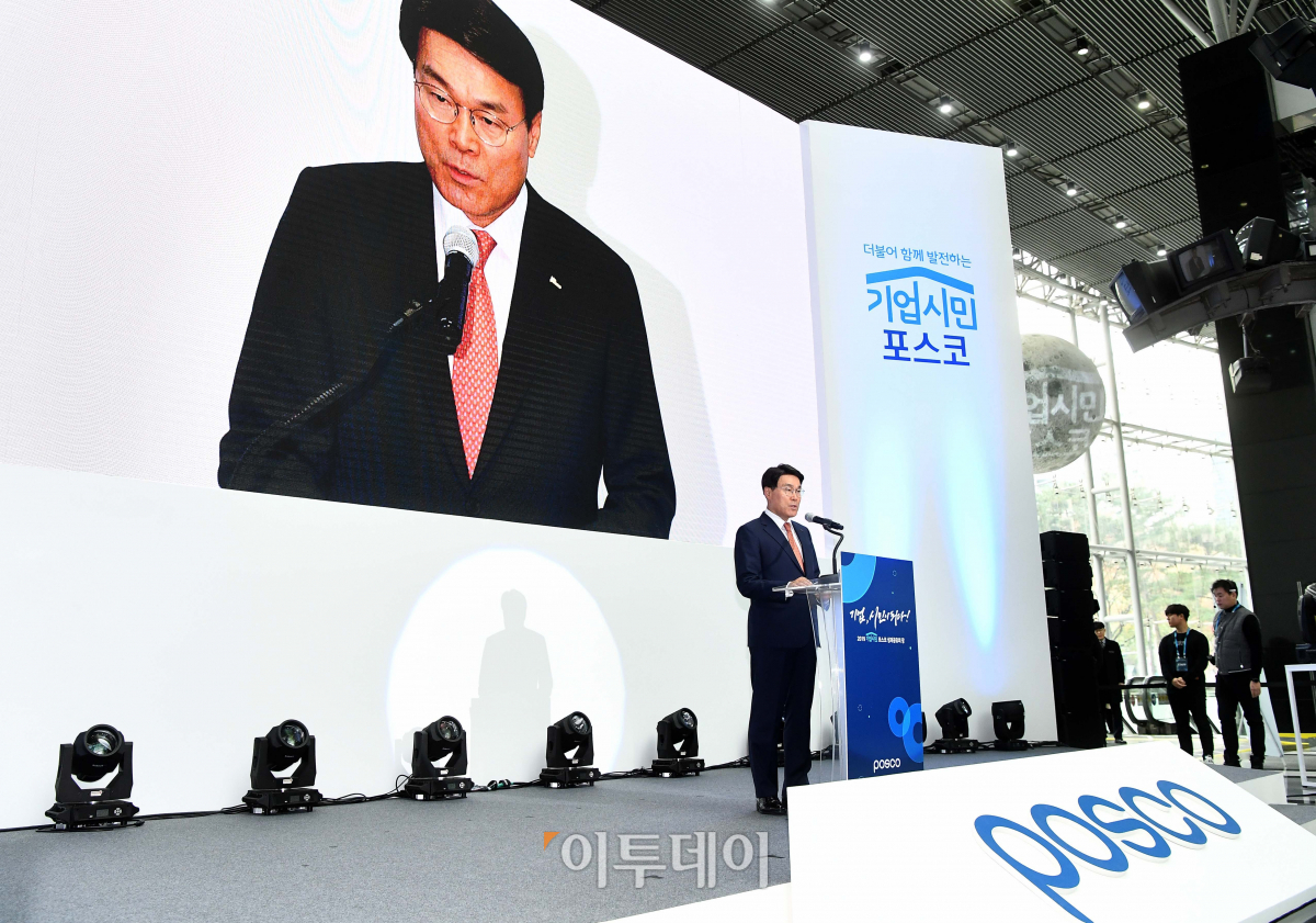 최정우 포스코 회장이 3일 서울 강남구 테헤란로 포스코센터에서 ‘기업, 시민이 되다’를 주제로 열린 ‘2019 기업시민 포스코 성과공유의 장’에서 환영사를 하고 있다.
