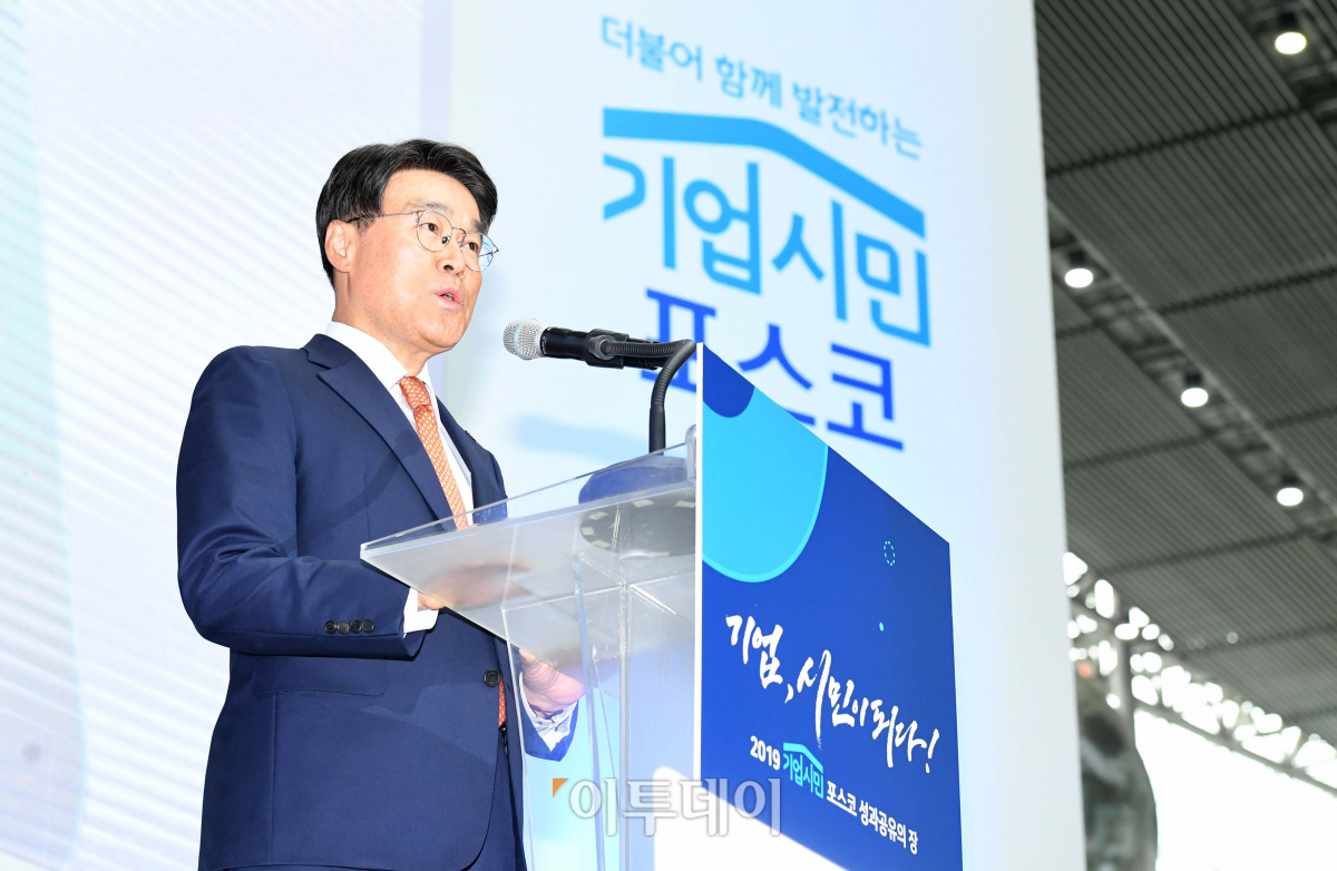 최정우 포스코 회장이 3일 서울 강남구 테헤란로 포스코센터에서 ‘기업, 시민이 되다’를 주제로 열린 ‘2019 기업시민 포스코 성과공유의 장’에서 환영사를 하고 있다.