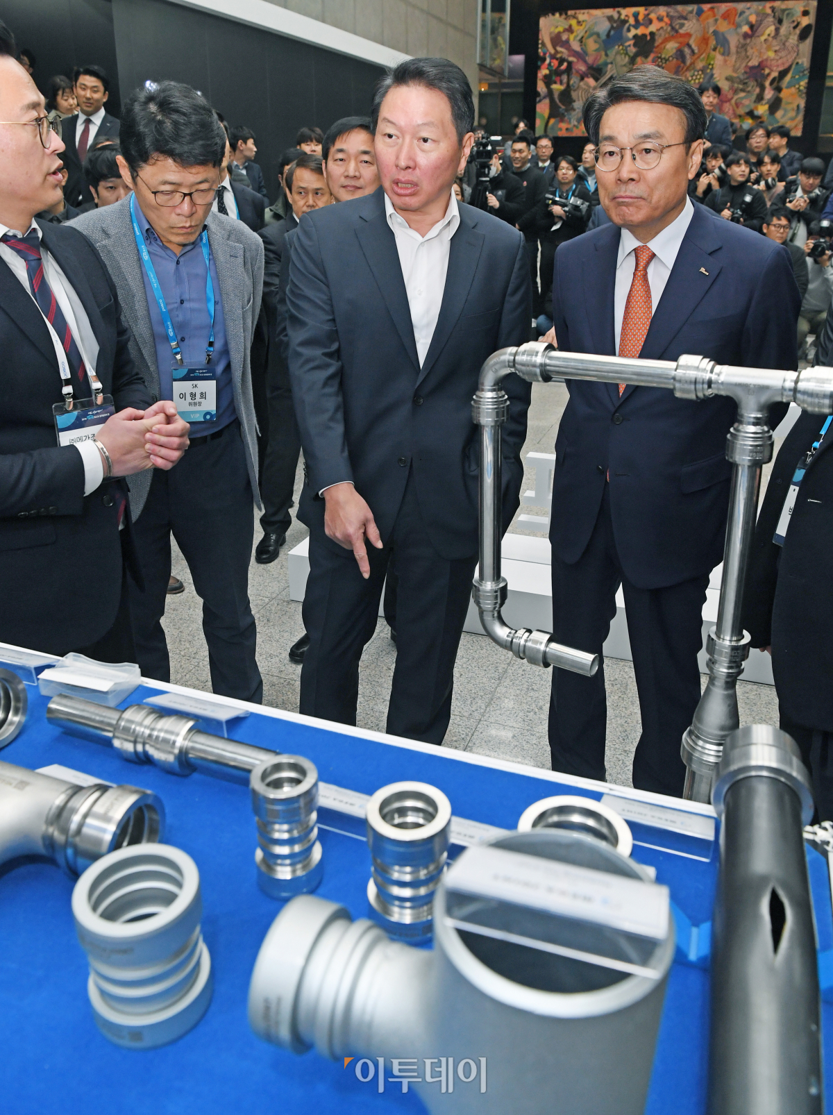 최정우 포스코 회장과 최태원 SK그룹 회장이 3일 서울 강남구 테헤란로 포스코센터에서 ‘기업, 시민이 되다’를 주제로 열린 ‘2019 기업시민 포스코 성과공유의 장’에서 행사장을 둘러보고 있다. 신태현 기자 holjjak@