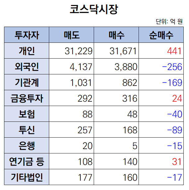 이날 외국인과 기관은 각각 256억 원, 169억 원어치 매물을 쏟아냈다. 개인은 홀로 441억 원 규모를 순매수했다.