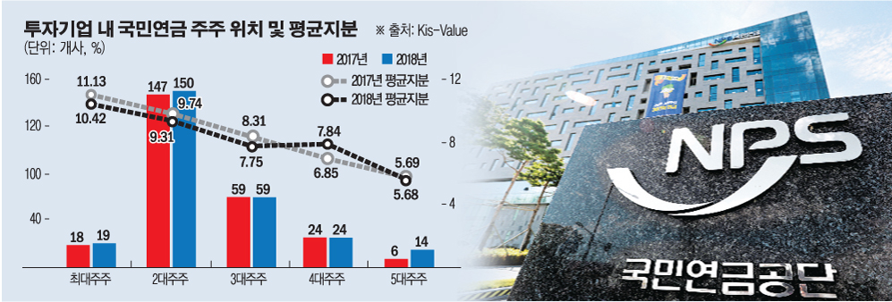 국민연금이 투자한 국내 상장사 5곳 중 2곳에서 5대 주주 이상의 지위를 확보하고 있는 것으로 조사됐다. 최대주주로 있는 기업은 19개사로, 2대 주주인 회사는 무려 150개사에 달했다.