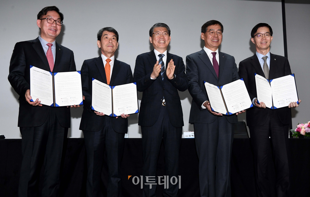 이대훈(왼쪽부터) 농협은행장, 이동걸 산업은행 회장, 은성수 금융위원장, 신학철 LG화학 부회장, 방문규 수출입은행장이 9일 서울 강서구 마곡 LG 사이언스파크에서 열린 ‘LG화학 산업·금융 협력프로그램 협약식’에서 기념촬영을 하고 있다. 이번 협약에 참여한 산업은행과 수출입은행, 농협은행 등은 2020년부터 2024년까지 총 50억 달러(약 5조9500억원) 규모로 LG화학에 2차전지 관련 전 세계 시설 투자 자금을 공급한다. 아울러 이들 금융기관과 LG화학은 1500억원 규모의 동반성장펀드를 조성해 2차전지 중소·중견 협력업체를 지원한다.