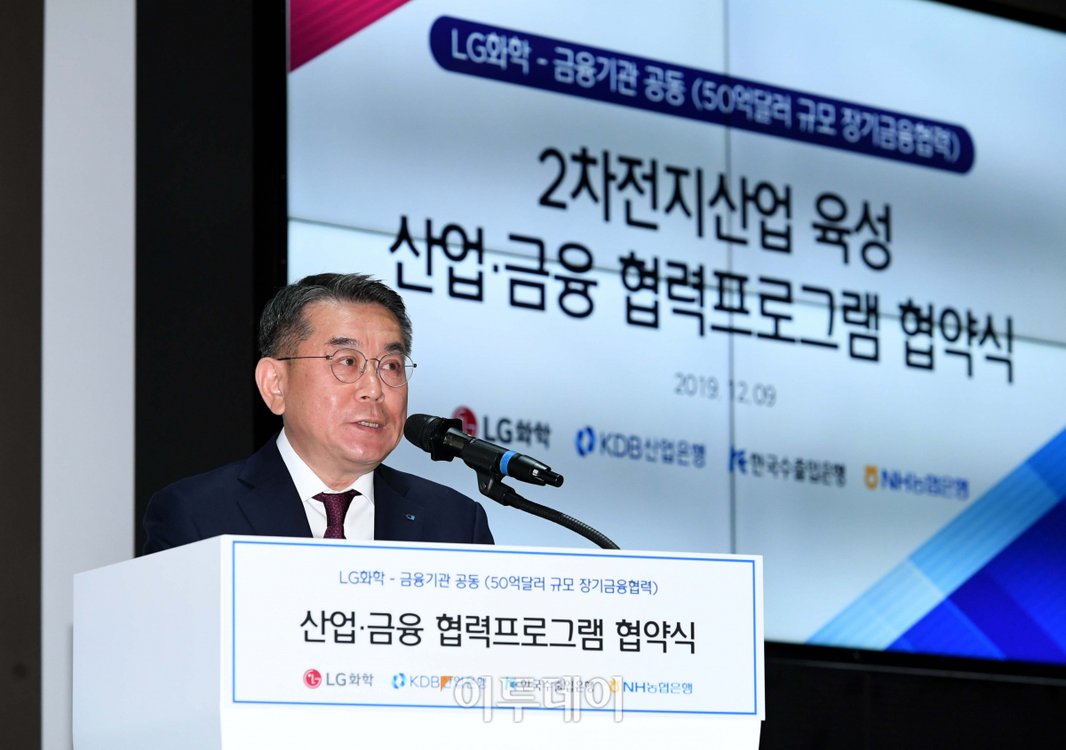 김준동 대한상공회의소 부회장 9일 서울 강서구 마곡 LG 사이언스파크에서 열린 ‘LG화학 산업·금융 협력프로그램 협약식’에서 인사말을 하고 있다. 이번 협약에 참여한 산업은행과 수출입은행, 농협은행 등은 2020년부터 2024년까지 총 50억 달러(약 5조9500억원) 규모로 LG화학에 2차전지 관련 전 세계 시설 투자 자금을 공급한다. 아울러 이들 금융기관과 LG화학은 1500억원 규모의 동반성장펀드를 조성해 2차전지 중소·중견 협력업체를 지원한다.