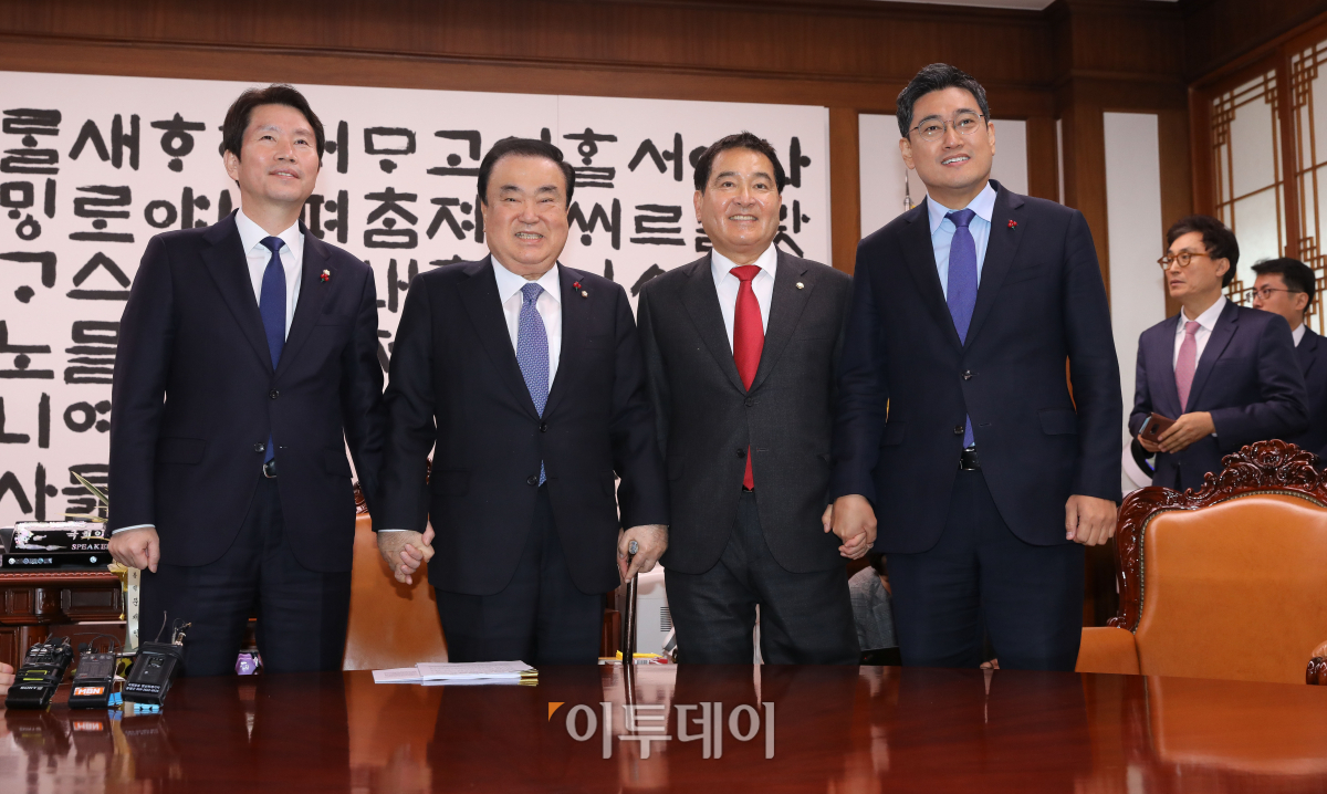 [포토] 손잡은 문희상 의장과 이인영-심재철-오신환 원내대표
