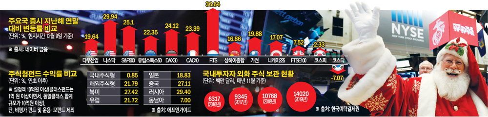 연초 이후 주가지수 변동률만 비교해도 펀드 수익률이 이처럼 차이 나는 이유를 알 수 있다. 9일 기준으로 지난해 연말 대비 코스피와 코스닥 변동률은 각각 2.33%, -7.07%다. 같은 기간 미국의 다우산업(19.64%), 나스닥(29.94%), S&P500(25.10%) 지수는 상승 랠리를 펼치며 지수 신고점을 연이어 경신했다.