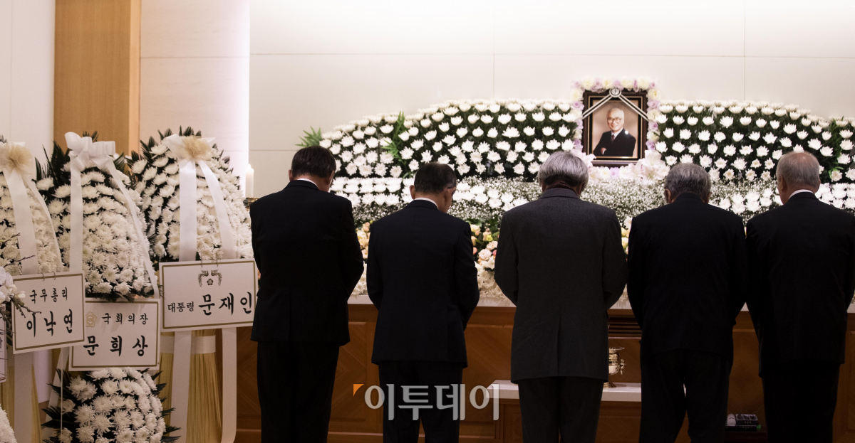 10일 경기 수원시 아주대병원 장례식장에 마련된 故 김우중 전 대우그룹 회장의 빈소에 문재인 대통령, 문희상 국회의장, 이낙연 국무총리의 조화가 놓여 있다. 김 전 회장은 지난 9일 오후 11시 50분 숙환으로 별세했다. 신태현 기자 holjjak@