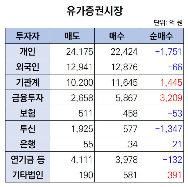 이날 기관은 홀로 1445억 원어치를 순매수하며 지수 상승을 견인했다. 특히 금융투자가 3209억 원어치를 사들였다. 반면 투신과 보험, 연기금 등은 각각 1347억 원, 132억 원, 53억 원을 순매도했다.