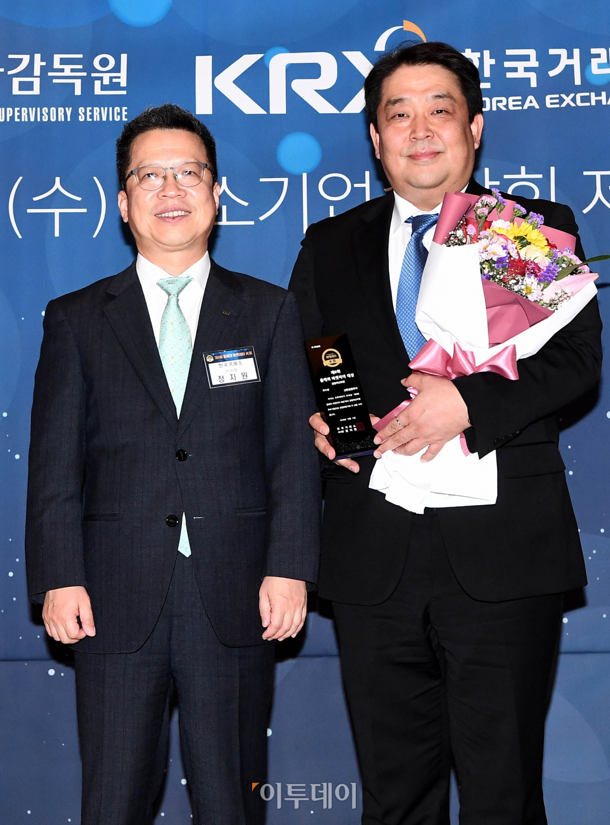‘제9회 올해의 마켓리더 대상’이 11일 서울 여의도 중소기업중앙회에서 열린 가운데 한국거래소이사장상을 수상한 박성진(오른쪽) 신한금융투자 경영지원그룹장과 시상자인 정지원 한국거래소 이사장이 기념촬영을 하고 있다.이투데이미디어가 주최한 이번 행사는 올 한해를 마감하면서 증권업계를 이끈 마켓리더들의 노력을 부각시키고 금융투자업계의 발전과 건전한 투자문화 정착을 위한 시장 분위기를 조성하기 위한 자리로 선진금융회사로 발돋움을 준비하고 있는 증권사, 자산운용사 등을 대상으로 10여개의 부문별 업체를 선정해 시상했다.