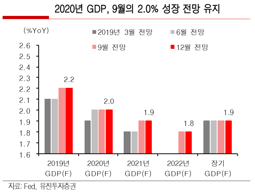 이 연구원은 “12월 경제전망에서 연준은 지난 9월의 향후 3년간 GDP성장률 및 물가 전망을 그대로 유지했다”며 “파월 의장은 현 통화정책 기조가 적정하며, 지표가 전망과 크게 다르지 않다면 금리동결을 지속할 방침을 밝혔다”고 설명했다.