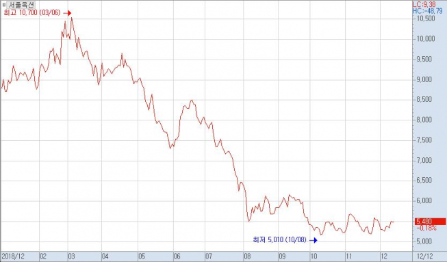 12일 서울옥션은 10원(-0.18%) 내린 5480원에 장을 마쳤다. 작년 12월 1만1150원을 찍었던 주가는 1년 새 절반가량 내렸다. 6월 홍콩시위가 발발한 이후부터 급락하다가 10월에는 5010원으로 52주 최저가를 기록했다.
