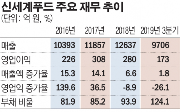신세계푸드는 최근 수년간의 외연 확대로 자본적 지출이 늘면서 차입금이 대폭 증가했다. 그룹 지원 등을 고려하면 현 수준의 재무 안정성 유지는 가능하리란 전망이 많지만, 수익성 하락 추세를 개선하지 못하면 단기간 차입 규모를 줄이기 어려울 것이란 관측이다. 신세계푸드의 총차입금은 2585억 원으로 2017년 말 1300억 원과 비교해 갑절로 늘었다. 이에 따라 부채비율은 85.1%에서 124.1%로, 차입금 의존도는 22.1%에서 35.6%로 증가했다.
