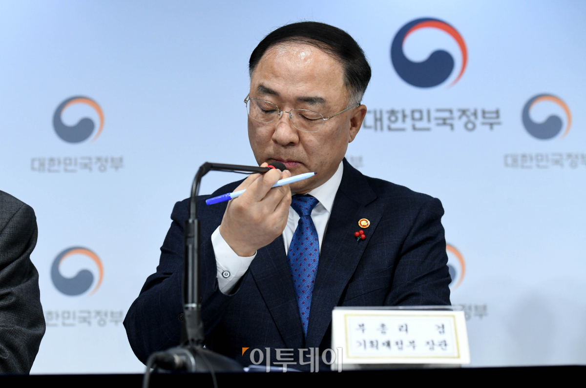 홍남기 부총리 겸 기획재정부 장관이 16일 서울 종로구 세종대로 정부서울청사에서 열린 주택시장 안정화 방안 관련 관계부처 합동 브리핑에서 잠시 눈을 감고 있다.