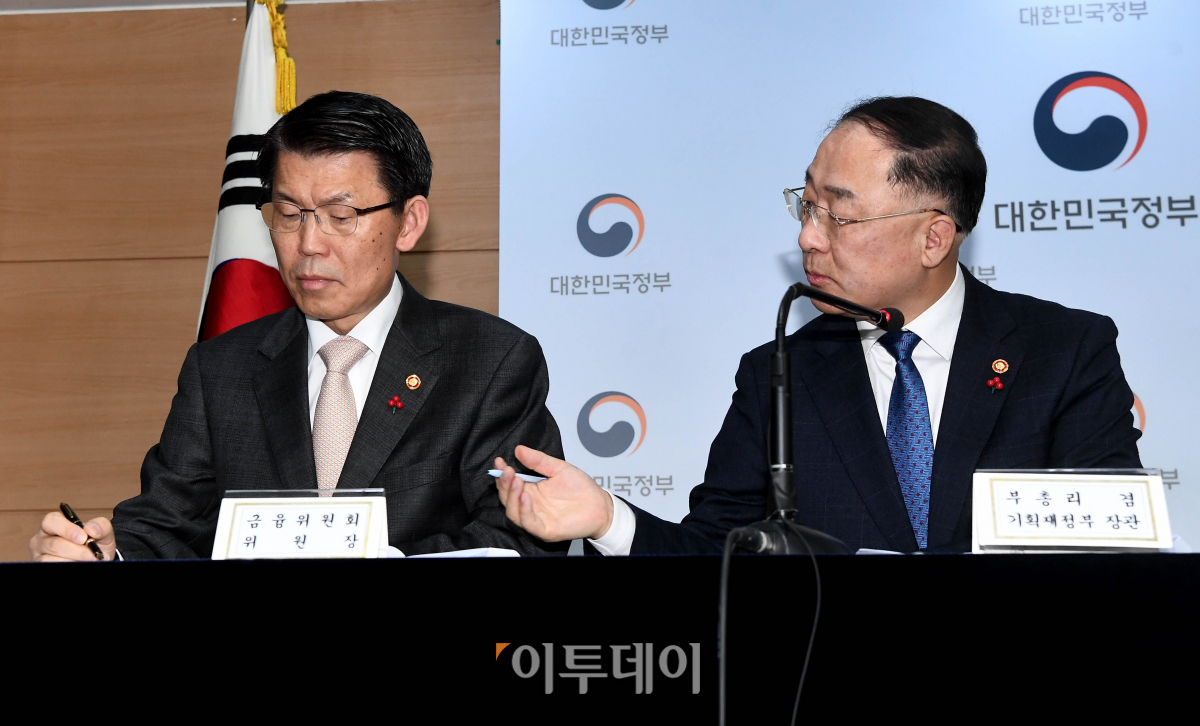 홍남기(오른쪽) 부총리 겸 기획재정부 장관과 은성수 금융위원장이 16일 서울 종로구 세종대로 정부서울청사에서 열린 주택시장 안정화 방안 관련 관계부처 합동 브리핑에서 대화하고 있다.