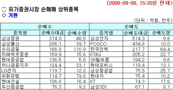 종목별로 기관은 유가증권시장에서 삼성증권 314억원, 삼성물산 206억원, 우리금융 166억원, 미래에셋증권 159억원 순으로 순매수했고 삼성전자 514억원, POSCO 434억원, 한국전력 217억원, KT&G 205억원 순으로 순매도했다.