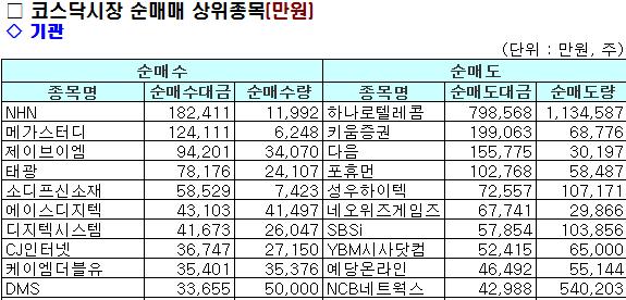 코스닥시장에서는 NHN 18억원, 메가스터디 12억원, 제이브이엠 9억원, 태광 7억원 순으로 순매수헸고 하나로텔레콤 79억원, 키움증권 19억원, 다음 15억원, 포휴먼 10억원 순으로 순매도했다.