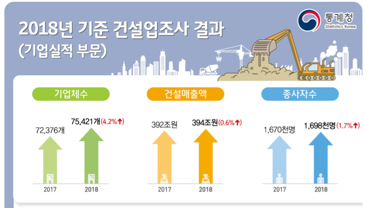 통계청이 18일 발표한 ‘2018년 건설업조사 결과(기업실적 부문)’에 따르면, 지난해 건설업 기업체 수는 7만5421개로 전년보다 3045개(4.2%), 종사자 수는 169만8000명으로 2만8000명(1.7%) 각각 증가했다. 산업별로 종합건설업체는 1만1039개로 4.0%, 전문직별 공사업체는 6만4382개로 4.3% 늘었다. 종사자 수는 종합건설업에서 54만3000명으로 3만2000명(6.3%) 늘었으나, 전문직별 공사업에선 115만5000명으로 5000명(0.4%) 줄었다.